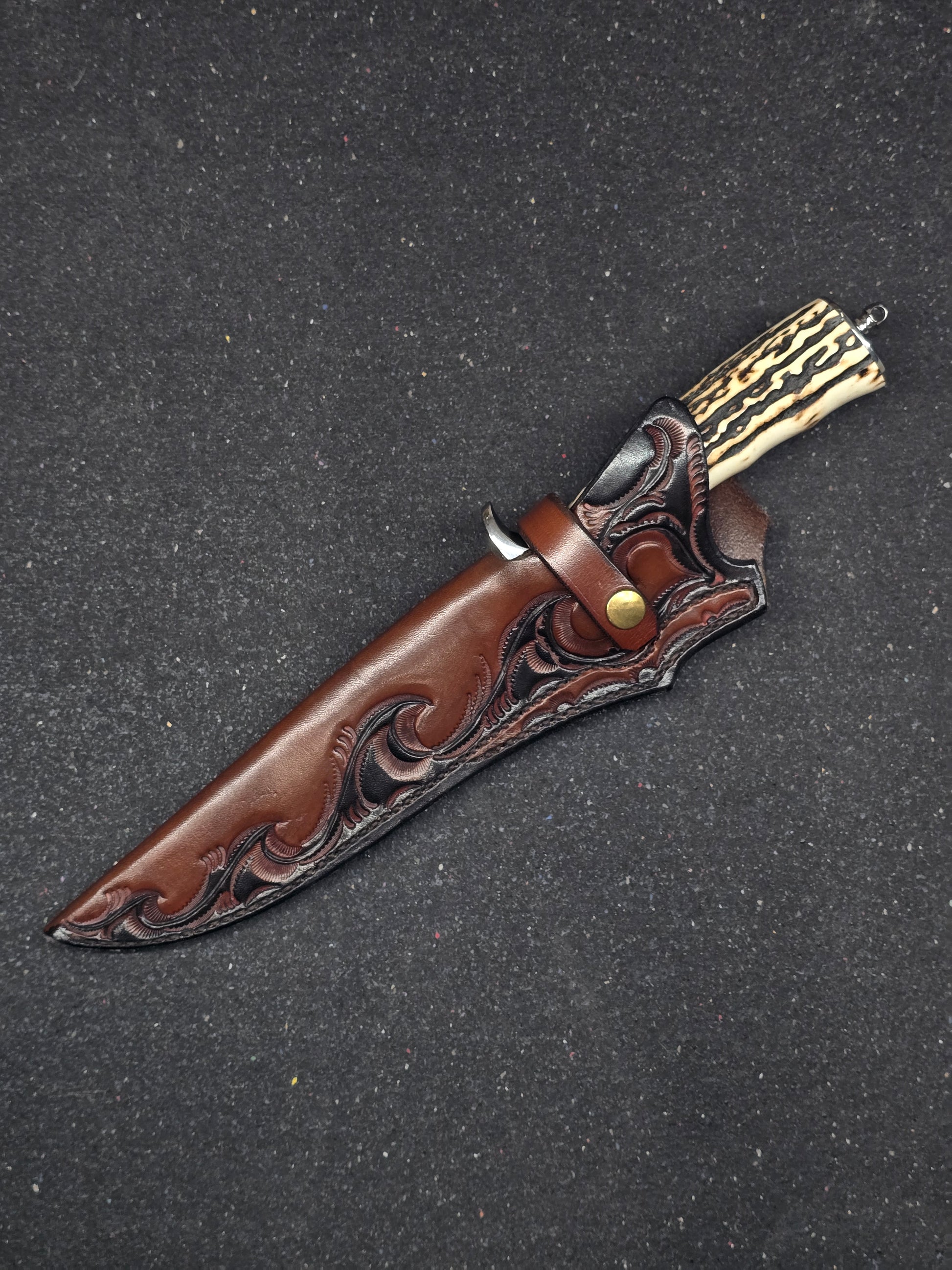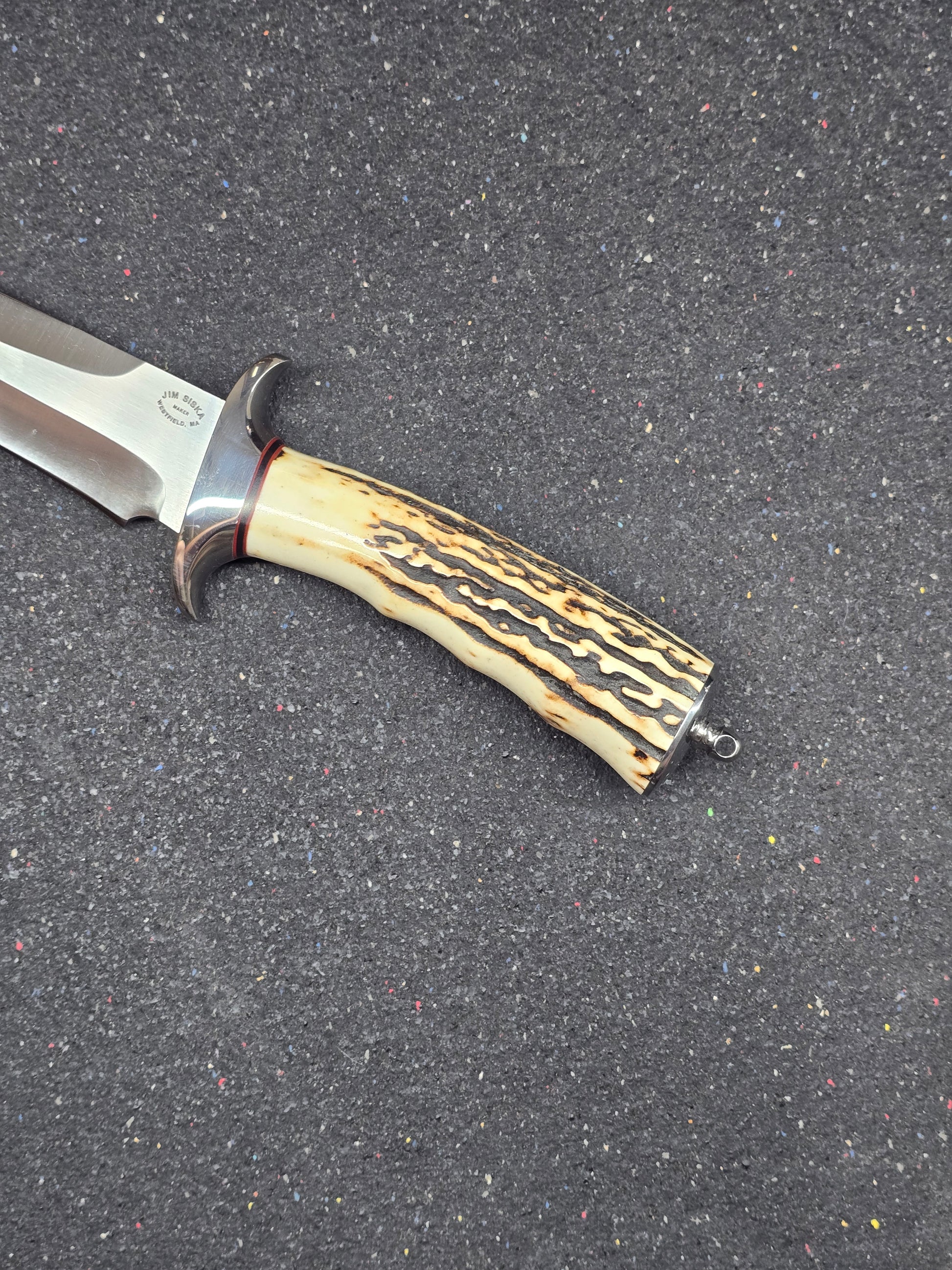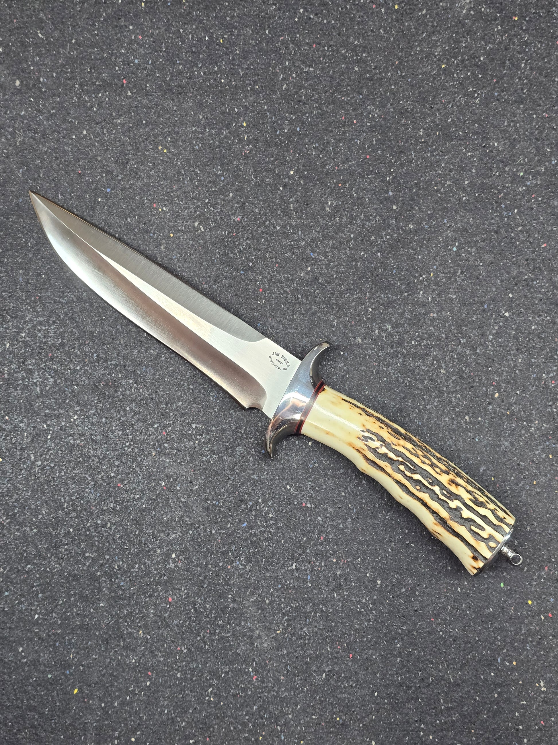 This is a beautifully crafted #16 Iron Wood Fighter by Jim Siska with leather sheath. Its built with a takedown design, featuring a polished hilt and rear bolster. Circa 1990 on the build of this one. If you are looking for a Siska fighter that is nearly in the wrapper look no further.